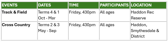 The Woady Yaloak Athletic Club provides opportunities in a range of athletic and fitness activities that are conducted throughout the year.
